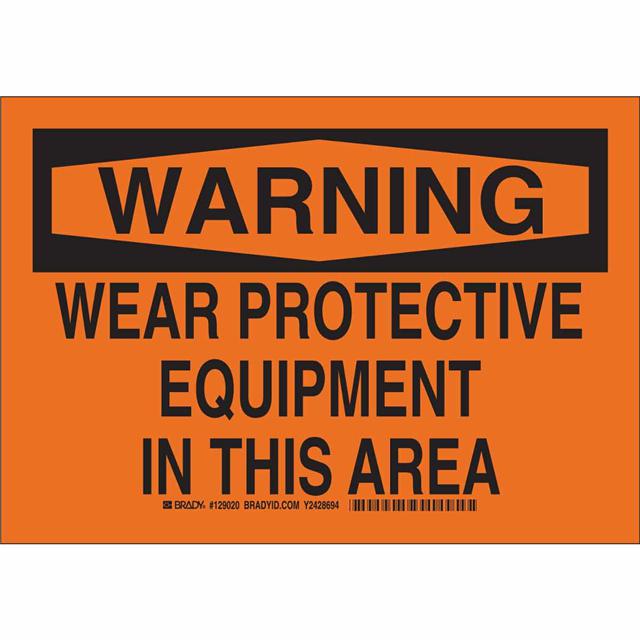 This is manufactured by Brady Corporation. The manufacturer part number is 129022. Label with a size of 14.00" l x 10.00" w (355.6mm x 254.0mm). The product is rohs3 compliant. It is assigned with possible HTSUS value of 3926.90.9985. It is shipped in bulk package . It has a classic black legend, orange background colour. The product brady®, is a highly preferred choice for users. The product is made from highly stable and reliable polyester. In addition, it is reach unaffected. Its typical moisture sensitivity level is not applicable. A bespoke label is a warning. wear protective equipment in this area label. The product is suitable for use with warning. The product is designated with the ear99 code number.