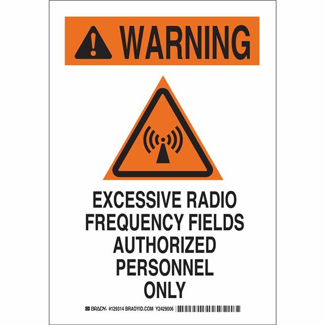 This is manufactured by Brady Corporation. The manufacturer part number is 129314. Label with a size of 10.00" l x 7.00" w (254.0mm x 177.8mm). The product is rohs3 compliant. It is assigned with possible HTSUS value of 3926.90.9985. It is shipped in bulk package . It has a classic black and orange legend, white background colour. The product brady®, is a highly preferred choice for users. The product is made from highly stable and reliable polyester. In addition, it is reach unaffected. Its typical moisture sensitivity level is not applicable. A bespoke label is a warning. excessive radio frequency fields authorized personnel only label. The product is suitable for use with warning. It has a long 4 weeks standard lead time. The product is designated with the ear99 code number.
