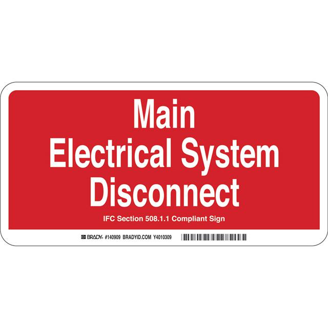 This is manufactured by Brady Corporation. The manufacturer part number is 140909. Label with a size of 10.00" l x 5.00" w (254.0mm x 127.0mm). The product is rohs3 compliant. It is assigned with possible HTSUS value of 3926.90.9985. It is shipped in bulk package . It has a classic white legend, red background colour. The product brady®, is a highly preferred choice for users. The product is made from highly stable and reliable polyester. In addition, it is reach unaffected. Its typical moisture sensitivity level is not applicable. A bespoke label is a main electrical system disconnect ifc section 508.1.1 compliant sign label. The product is suitable for use with warning. The product is designated with the ear99 code number.
