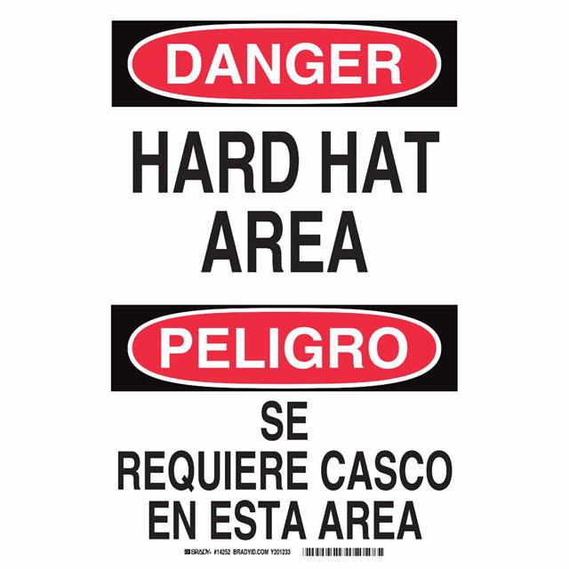 This is manufactured by Brady Corporation. The manufacturer part number is 14252. Label with a size of 14.00" l x 10.00" w (355.6mm x 254.0mm). The product is rohs3 compliant. It is assigned with possible HTSUS value of 3926.90.9985. It is shipped in bulk package . It has a classic black and red legend, white background colour. The product brady®, is a highly preferred choice for users. The product is made from highly stable and reliable polyester. In addition, it is reach unaffected. Its typical moisture sensitivity level is not applicable. A bespoke label is a danger/peligro. hard hat area/se requiere casco en esta area label. It has a long 4 weeks standard lead time. The product is designated with the ear99 code number.