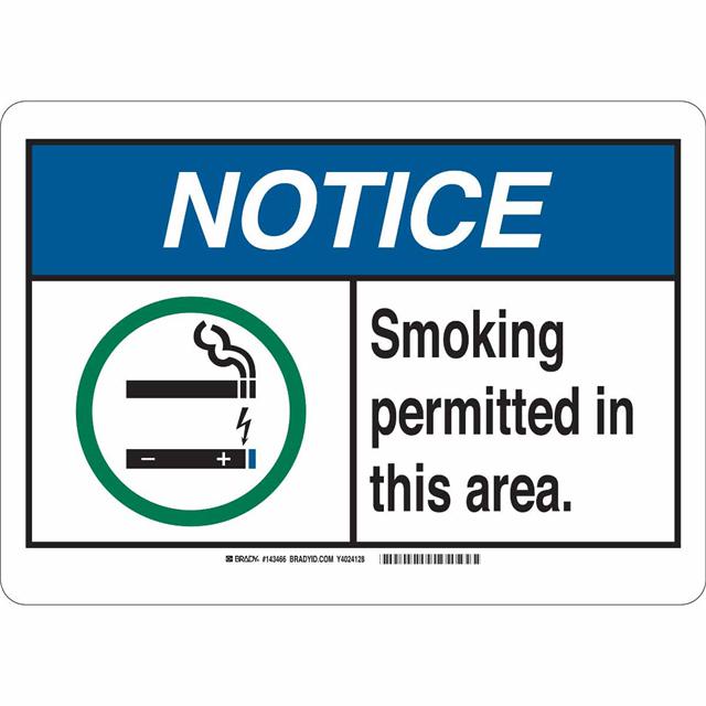 This is manufactured by Brady Corporation. The manufacturer part number is 143461. Label with a size of 10.00" l x 7.00" w (254.0mm x 177.8mm). The product is rohs3 compliant. It is assigned with possible HTSUS value of 8310.00.0000. It has a classic black, blue and green legend, white background colour. The product brady®, is a highly preferred choice for users. The product is made from highly stable and reliable aluminum. In addition, it is reach unaffected. Its typical moisture sensitivity level is not applicable. In addition, bulk is the available packaging type of the product. A bespoke label is a notice. smoking permitted in this area label. The product is suitable for use with notice. It has a long 4 weeks standard lead time. The brady corporation's product offers user-desired applications. The product is designated with the ear99 code number.