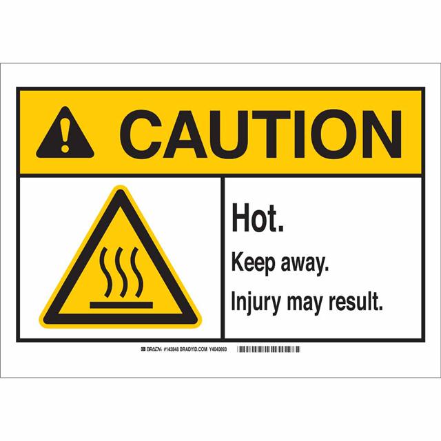 This is manufactured by Brady Corporation. The manufacturer part number is 143849. Label with a size of 10.00" l x 7.00" w (254.0mm x 177.8mm). The product is rohs3 compliant. It is assigned with possible HTSUS value of 3926.90.9985. It is shipped in bulk package . It has a classic black and yellow legend, white background colour. The product brady®, is a highly preferred choice for users. The product is made from highly stable and reliable polyester. In addition, it is reach unaffected. Its typical moisture sensitivity level is not applicable. A bespoke label is a caution. hot. keep away. injury may result label. The product is designated with the ear99 code number.