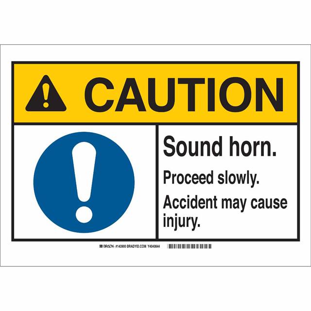 This is manufactured by Brady Corporation. The manufacturer part number is 143901. Label with a size of 10.00" l x 7.00" w (254.0mm x 177.8mm). The product is rohs3 compliant. It is assigned with possible HTSUS value of 8310.00.0000. It is shipped in bulk package . It has a classic black, blue and yellow legend, white background colour. The product brady®, is a highly preferred choice for users. The product is made from highly stable and reliable aluminum. In addition, it is reach unaffected. Its typical moisture sensitivity level is not applicable. A bespoke label is a caution. sound horn proceed slowly. accident may cause injury label. The product is designated with the ear99 code number.