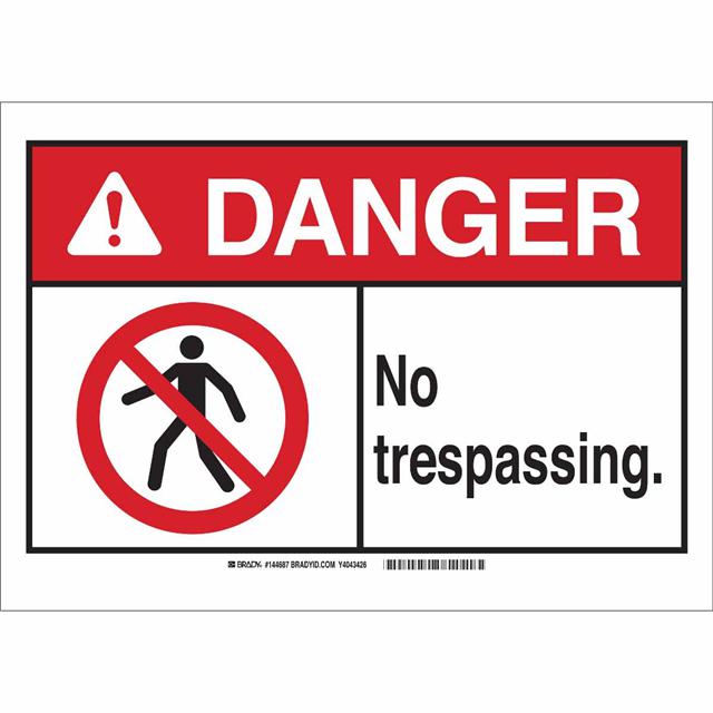 This is manufactured by Brady Corporation. The manufacturer part number is 144686. Label with a size of 10.00" l x 7.00" w (254.0mm x 177.8mm). The product is rohs3 compliant. It is assigned with possible HTSUS value of 3926.90.9985. It is shipped in bulk package . It has a classic black and red legend, white background colour. The product brady®, is a highly preferred choice for users. The product is made from highly stable and reliable polyester. In addition, it is reach unaffected. Its typical moisture sensitivity level is not applicable. A bespoke label is a danger. no trespassing. label. The product is suitable for use with warning. The product is designated with the ear99 code number.