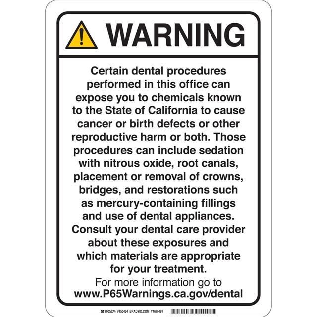 This is manufactured by Brady Corporation. The manufacturer part number is 150479. Label with a size of 10.00" l x 7.00" w (254.0mm x 177.8mm). The product is rohs3 compliant. It is assigned with possible HTSUS value of 3926.90.9985. It is shipped in bulk package . It has a classic black legend, white background colour. The product brady®, is a highly preferred choice for users. The product is made from highly stable and reliable polyester. In addition, it is reach unaffected. Its typical moisture sensitivity level is not applicable. A bespoke label is a warning. certain dental procedures performed in this office can expose you to chemicals known to the state of california to ca… label. The product is suitable for use with warning. It has a long 4 weeks standard lead time. The product is designated with the ear99 code number.