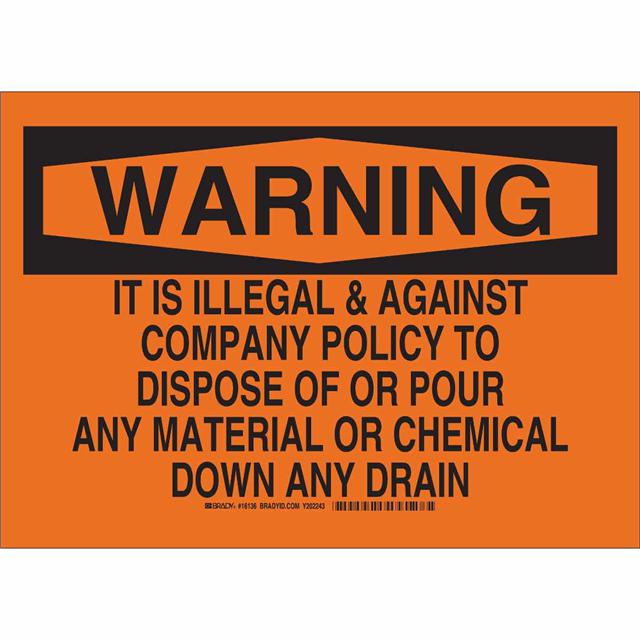This is manufactured by Brady Corporation. The manufacturer part number is 16136. Label with a size of 14.00" l x 10.00" w (355.6mm x 254.0mm). The product is rohs3 compliant. It is assigned with possible HTSUS value of 3926.90.9985. It is shipped in bulk package . It has a classic black legend, orange background colour. The product brady®, is a highly preferred choice for users. The product is made from highly stable and reliable polyester. In addition, it is reach unaffected. Its typical moisture sensitivity level is not applicable. A bespoke label is a warning. it is illegal and against company policy to dispose of or pour any material or chemical down any drain label. The product is suitable for use with notice. It has a long 4 weeks standard lead time. The product is designated with the ear99 code number.