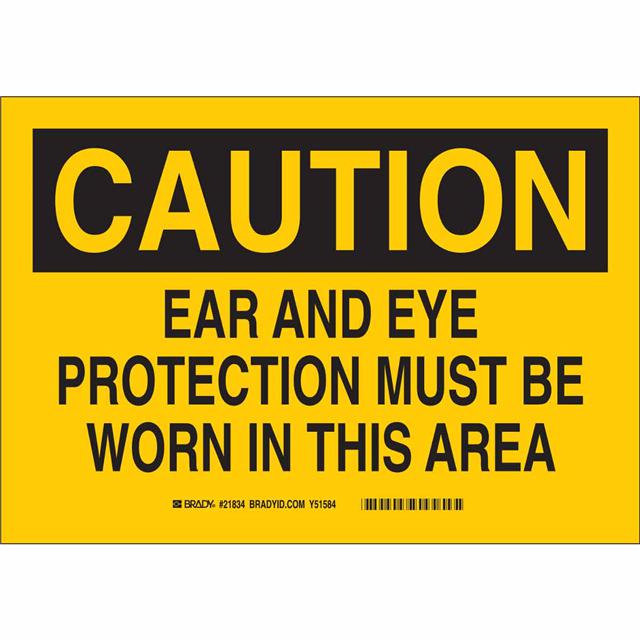 This is manufactured by Brady Corporation. The manufacturer part number is 21834. Label with a size of 10.00" l x 7.00" w (254.0mm x 177.8mm). The product is rohs3 compliant. It is assigned with possible HTSUS value of 3926.90.9985. It is shipped in bulk package . It has a classic black legend, yellow background colour. The product brady®, is a highly preferred choice for users. The product is made from highly stable and reliable polyester. In addition, it is reach unaffected. Its typical moisture sensitivity level is not applicable. A bespoke label is a caution. ear and eye protection must be worn in this area label. The product is suitable for use with caution. It has a long 4 weeks standard lead time. The product is designated with the ear99 code number.