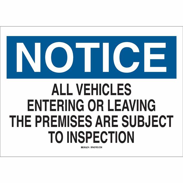 This is manufactured by Brady Corporation. The manufacturer part number is 22138. Label with a size of 14.00" l x 10.00" w (355.6mm x 254.0mm). The product is rohs3 compliant. It is assigned with possible HTSUS value of 3926.90.9985. It is shipped in bulk package . It has a classic black and blue legend, white background colour. The product brady®, is a highly preferred choice for users. The product is made from highly stable and reliable polyester. In addition, it is reach unaffected. Its typical moisture sensitivity level is not applicable. A bespoke label is a notice. all vehicles entering or leaving the premises are subject to inspection label. The product is suitable for use with notice. The product is designated with the ear99 code number.