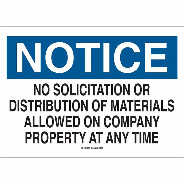 This is manufactured by Brady Corporation. The manufacturer part number is 22160. Label with a size of 14.00" l x 10.00" w (355.6mm x 254.0mm). The product is rohs3 compliant. It is assigned with possible HTSUS value of 3926.90.9985. It is shipped in bulk package . It has a classic black and blue legend, white background colour. The product brady®, is a highly preferred choice for users. The product is made from highly stable and reliable polyester. In addition, it is reach unaffected. Its typical moisture sensitivity level is not applicable. A bespoke label is a notice. no solicitation or distribution of materials allowed on company property at any time label. The product is suitable for use with notice. The product is designated with the ear99 code number.