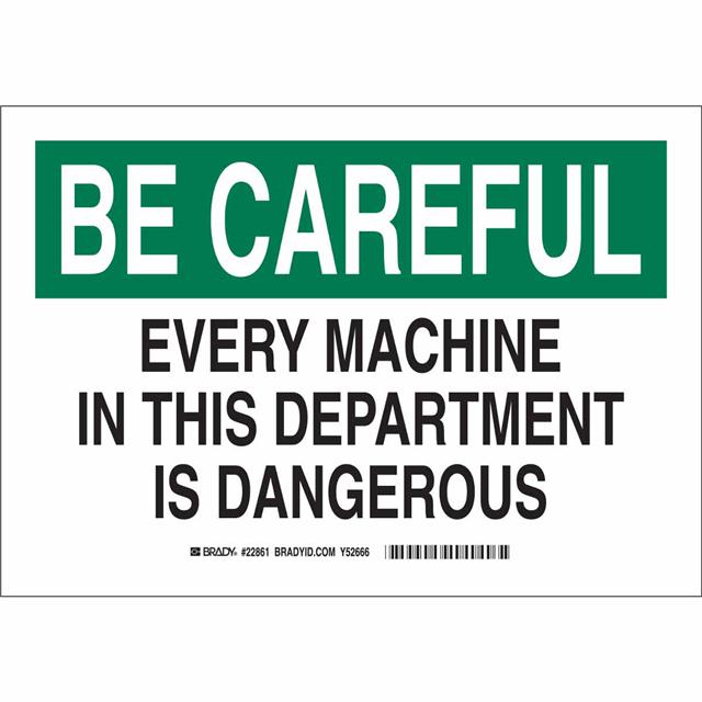 This is manufactured by Brady Corporation. The manufacturer part number is 22861. Label with a size of 10.00" l x 7.00" w (254.0mm x 177.8mm). The product is rohs3 compliant. It is assigned with possible HTSUS value of 3926.90.9985. It is shipped in bulk package . It has a classic black and green legend, white background colour. The product brady®, is a highly preferred choice for users. The product is made from highly stable and reliable polyester. In addition, it is reach unaffected. Its typical moisture sensitivity level is not applicable. A bespoke label is a be careful. every machine in this department is dangerous label. The product is suitable for use with warning. It has a long 4 weeks standard lead time. The product is designated with the ear99 code number.