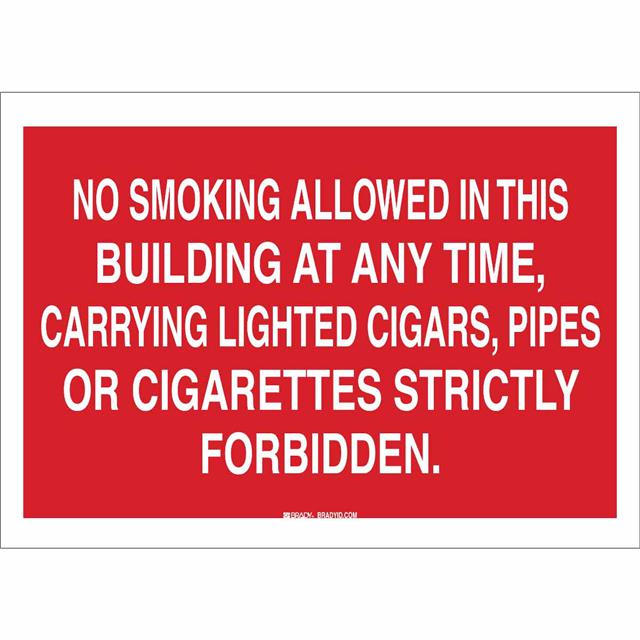 This is manufactured by Brady Corporation. The manufacturer part number is 25122. Label with a size of 10.00" l x 7.00" w (254.0mm x 177.8mm). The product is rohs3 compliant. It is assigned with possible HTSUS value of 3926.90.9989. It has a classic white legend, red background colour. The product brady®, is a highly preferred choice for users. The product is made from highly stable and reliable polyester. In addition, it is reach unaffected. Its typical moisture sensitivity level is not applicable. In addition, bulk is the available packaging type of the product. A bespoke label is a no smoking allowed in this building at any time, carrying lighted cigars, pipes or cigarettes strictly forbidden label. The product is suitable for use with warning. The brady corporation's product offers user-desired applications. The product is designated with the ear99 code number.