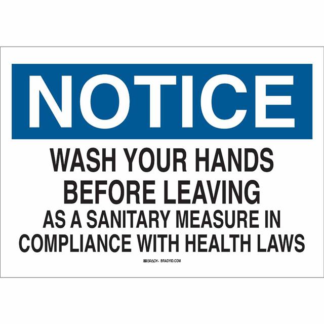 This is manufactured by Brady Corporation. The manufacturer part number is 25152. Label with a size of 14.00" l x 10.00" w (355.6mm x 254.0mm). The product is rohs3 compliant. It is assigned with possible HTSUS value of 3926.90.9985. It is shipped in bulk package . It has a classic black and blue legend, white background colour. The product brady®, is a highly preferred choice for users. The product is made from highly stable and reliable polyester. In addition, it is reach unaffected. Its typical moisture sensitivity level is not applicable. A bespoke label is a notice. wash your hands before leaving as a sanitary measure in compliance with health laws label. The product is suitable for use with notice. It has a long 4 weeks standard lead time. The product is designated with the ear99 code number.