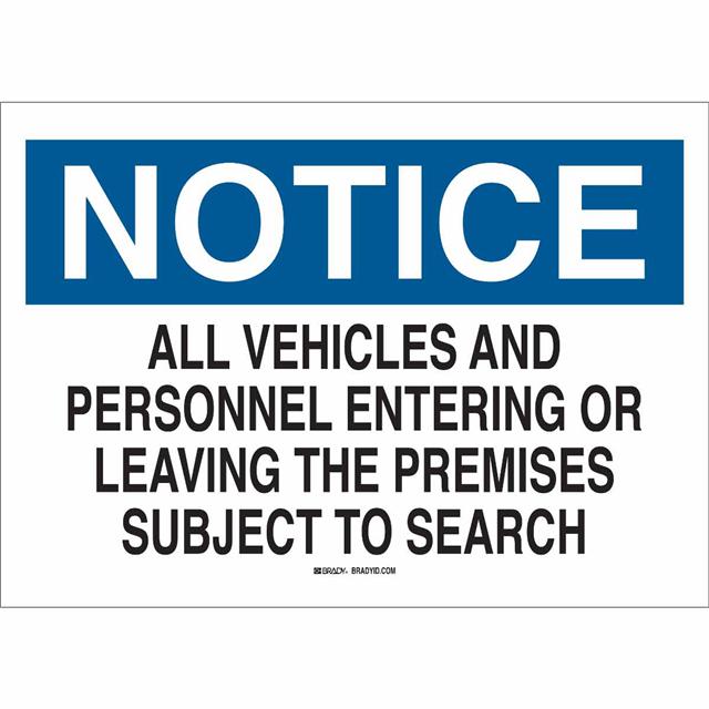This is manufactured by Brady Corporation. The manufacturer part number is 25819. Label with a size of 14.00" l x 10.00" w (355.6mm x 254.0mm). The product is rohs3 compliant. It is assigned with possible HTSUS value of 3926.90.9985. It is shipped in bulk package . It has a classic black and blue legend, white background colour. The product brady®, is a highly preferred choice for users. The product is made from highly stable and reliable polyester. In addition, it is reach unaffected. Its typical moisture sensitivity level is not applicable. A bespoke label is a notice. all vehicles and personnel entering or leaving the premises subject to search label. It has a long 4 weeks standard lead time. The product is designated with the ear99 code number.