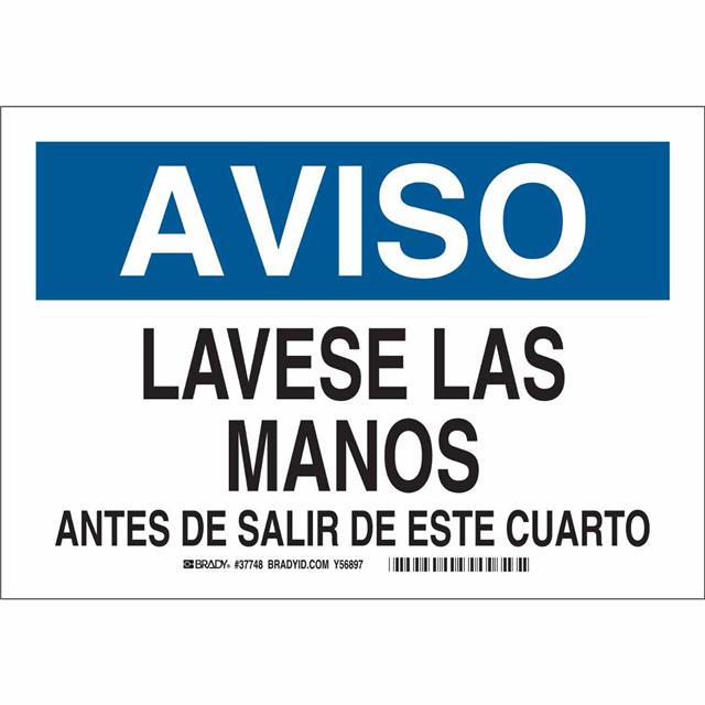 This is manufactured by Brady Corporation. The manufacturer part number is 37748. Label with a size of 10.00" l x 7.00" w (254.0mm x 177.8mm). The product is rohs3 compliant. It is assigned with possible HTSUS value of 3926.90.9985. It is shipped in bulk package . It has a classic black and blue legend, white background colour. The product brady®, is a highly preferred choice for users. The product is made from highly stable and reliable polyester. In addition, it is reach unaffected. Its typical moisture sensitivity level is not applicable. A bespoke label is a aviso. lavese las manos antes de salir de este cuarto label. The product is suitable for use with notice. It has a long 4 weeks standard lead time. The product is designated with the ear99 code number.