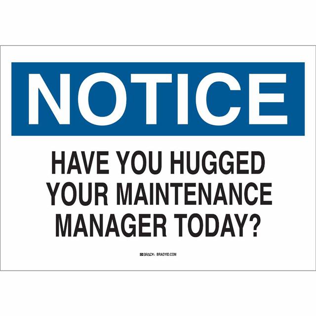 This is manufactured by Brady Corporation. The manufacturer part number is 38062. Label with a size of 10.00" l x 7.00" w (254.0mm x 177.8mm). The product is rohs3 compliant. It is assigned with possible HTSUS value of 3926.90.9985. It is shipped in bulk package . It has a classic black and blue legend, white background colour. The product brady®, is a highly preferred choice for users. The product is made from highly stable and reliable polyester. In addition, it is reach unaffected. Its typical moisture sensitivity level is not applicable. A bespoke label is a notice. have you hugged your maintenance manager today label. The product is suitable for use with notice. It has a long 4 weeks standard lead time. The product is designated with the ear99 code number.