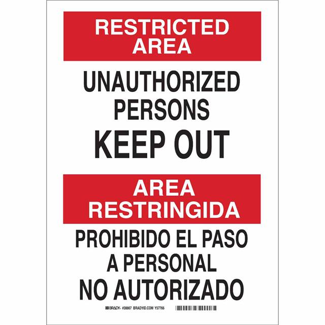 This is manufactured by Brady Corporation. The manufacturer part number is 38616. Label with a size of 14.00" l x 10.00" w (355.6mm x 254.0mm). The product is rohs3 compliant. It is assigned with possible HTSUS value of 3926.90.9985. It is shipped in bulk package . It has a classic black and red legend, white background colour. The product brady®, is a highly preferred choice for users. The product is made from highly stable and reliable polyester. In addition, it is reach unaffected. Its typical moisture sensitivity level is not applicable. A bespoke label is a restricted area/area restringida. unauthorized persons keep out/personal no autorizado mantengase afuera label. The product is suitable for use with warning. It has a long 4 weeks standard lead time. The product is designated with the ear99 code number.