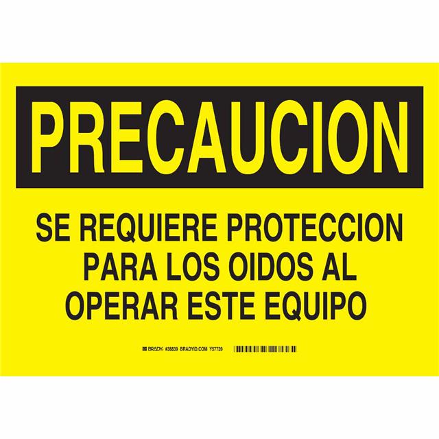 This is manufactured by Brady Corporation. The manufacturer part number is 38839. Label with a size of 14.00" l x 10.00" w (355.6mm x 254.0mm). The product is rohs3 compliant. It is assigned with possible HTSUS value of 3926.90.9985. It is shipped in bulk package . It has a classic black legend, yellow background colour. The product brady®, is a highly preferred choice for users. The product is made from highly stable and reliable polyester. In addition, it is reach unaffected. Its typical moisture sensitivity level is not applicable. A bespoke label is a precaucion. se requiere proteccion para los oidos al operar este equipo label. The product is suitable for use with caution. The product is designated with the ear99 code number.