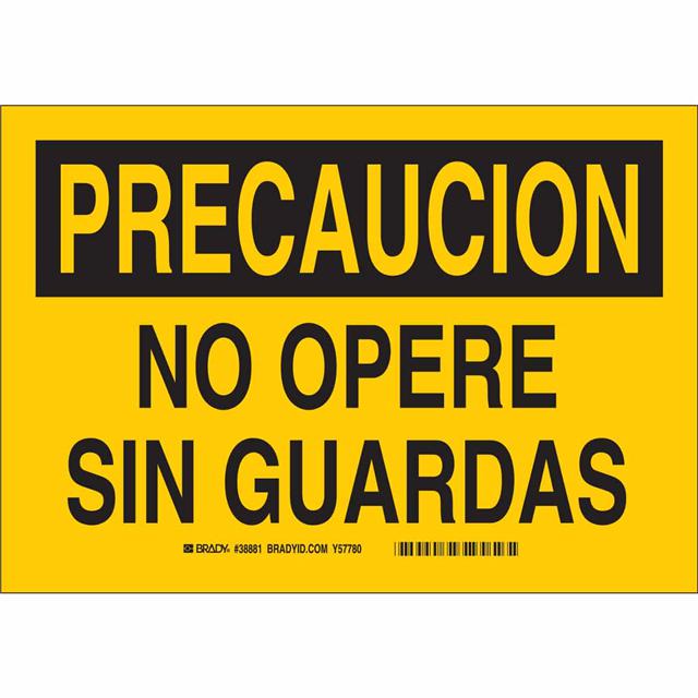 This is manufactured by Brady Corporation. The manufacturer part number is 38881. Label with a size of 10.00" l x 7.00" w (254.0mm x 177.8mm). The product is rohs3 compliant. It is assigned with possible HTSUS value of 3926.90.9985. It is shipped in bulk package . It has a classic black legend, yellow background colour. The product brady®, is a highly preferred choice for users. The product is made from highly stable and reliable polyester. In addition, it is reach unaffected. Its typical moisture sensitivity level is not applicable. A bespoke label is a precaucion. no opere sin guardas label. The product is suitable for use with caution. It has a long 4 weeks standard lead time. The product is designated with the ear99 code number.