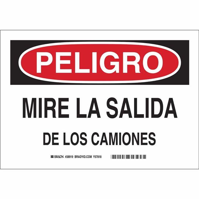 This is manufactured by Brady Corporation. The manufacturer part number is 38919. Label with a size of 14.00" l x 10.00" w (355.6mm x 254.0mm). The product is rohs3 compliant. It is assigned with possible HTSUS value of 3926.90.9985. It is shipped in bulk package . It has a classic black and red legend, white background colour. The product brady®, is a highly preferred choice for users. The product is made from highly stable and reliable polyester. In addition, it is reach unaffected. Its typical moisture sensitivity level is not applicable. A bespoke label is a peligro. mire la salida de los camiones label. The product is suitable for use with danger. It has a long 4 weeks standard lead time. The product is designated with the ear99 code number.