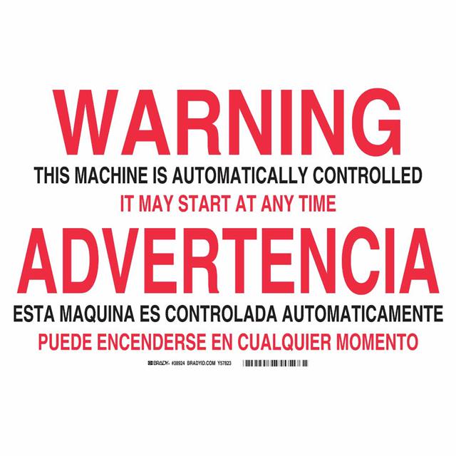 This is manufactured by Brady Corporation. The manufacturer part number is 38924. Label with a size of 14.00" l x 10.00" w (355.6mm x 254.0mm). The product is rohs3 compliant. It is assigned with possible HTSUS value of 3926.90.9985. It is shipped in bulk package . It has a classic black and red legend, white background colour. The product brady®, is a highly preferred choice for users. The product is made from highly stable and reliable polyester. In addition, it is reach unaffected. Its typical moisture sensitivity level is not applicable. A bespoke label is a warning/advertencia. this machine is automatically controlled it may start at any time/esta maquina es controlada automaticame… label. The product is suitable for use with warning. It has a long 4 weeks standard lead time. The product is designated with the ear99 code number.