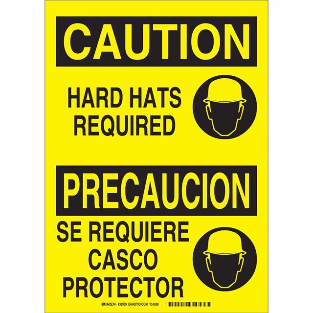 This is manufactured by Brady Corporation. The manufacturer part number is 38939. Label with a size of 14.00" l x 10.00" w (355.6mm x 254.0mm). The product is rohs3 compliant. It is assigned with possible HTSUS value of 3926.90.9985. It is shipped in bulk package . It has a classic black legend, yellow background colour. The product brady®, is a highly preferred choice for users. The product is made from highly stable and reliable polyester. In addition, it is reach unaffected. Its typical moisture sensitivity level is not applicable. A bespoke label is a caution/precaucion. hard hats required/se reuiere casco protector label. The product is suitable for use with caution. It has a long 4 weeks standard lead time. The product is designated with the ear99 code number.