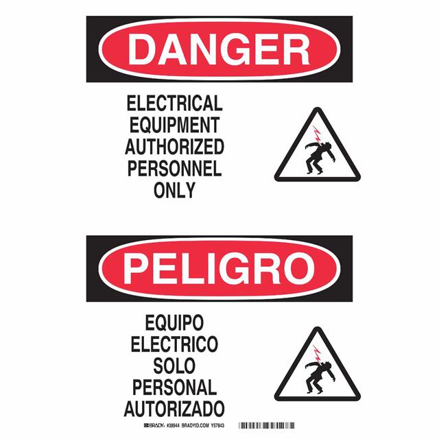 This is manufactured by Brady Corporation. The manufacturer part number is 38944. Label with a size of 14.00" l x 10.00" w (355.6mm x 254.0mm). The product is rohs3 compliant. It is assigned with possible HTSUS value of 3926.90.9985. It is shipped in bulk package . It has a classic black and red legend, white background colour. The product brady®, is a highly preferred choice for users. The product is made from highly stable and reliable polyester. In addition, it is reach unaffected. Its typical moisture sensitivity level is not applicable. A bespoke label is a danger/peligro. electrical equipment authorized personnel only/equipo electrico solo personal autorizado label. The product is suitable for use with danger. It has a long 4 weeks standard lead time. The product is designated with the ear99 code number.