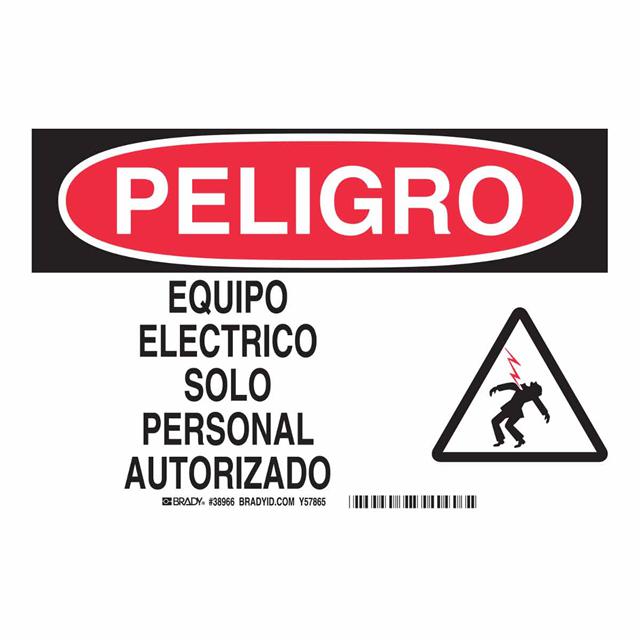 This is manufactured by Brady Corporation. The manufacturer part number is 38966. Label with a size of 10.00" l x 7.00" w (254.0mm x 177.8mm). The product is rohs3 compliant. It is assigned with possible HTSUS value of 3926.90.9985. It is shipped in bulk package . It has a classic black and red legend, white background colour. The product brady®, is a highly preferred choice for users. The product is made from highly stable and reliable polyester. In addition, it is reach unaffected. Its typical moisture sensitivity level is not applicable. A bespoke label is a peligro. equipo electrico solo personal autorizado label. The product is suitable for use with danger. It has a long 4 weeks standard lead time. The product is designated with the ear99 code number.