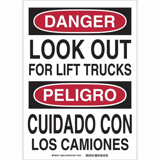 This is manufactured by Brady Corporation. The manufacturer part number is 39005. Label with a size of 14.00" l x 10.00" w (355.6mm x 254.0mm). The product is rohs3 compliant. It is assigned with possible HTSUS value of 3926.90.9985. It is shipped in bulk package . It has a classic black and red legend, white background colour. The product brady®, is a highly preferred choice for users. The product is made from highly stable and reliable polyester. In addition, it is reach unaffected. Its typical moisture sensitivity level is not applicable. A bespoke label is a danger/peligro. look out for lift trucks/cuidado con los camiones label. The product is suitable for use with danger. It has a long 4 weeks standard lead time. The product is designated with the ear99 code number.