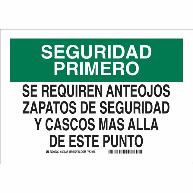This is manufactured by Brady Corporation. The manufacturer part number is 39037. Label with a size of 14.00" l x 10.00" w (355.6mm x 254.0mm). The product is rohs3 compliant. It is assigned with possible HTSUS value of 3926.90.9985. It is shipped in bulk package . It has a classic black and green legend, white background colour. The product brady®, is a highly preferred choice for users. The product is made from highly stable and reliable polyester. In addition, it is reach unaffected. Its typical moisture sensitivity level is not applicable. A bespoke label is a seguridad primero. se requiren anteojos zapatos de seguridad y cascos mas alla de este punto label. The product is suitable for use with warning. It has a long 4 weeks standard lead time. The product is designated with the ear99 code number.