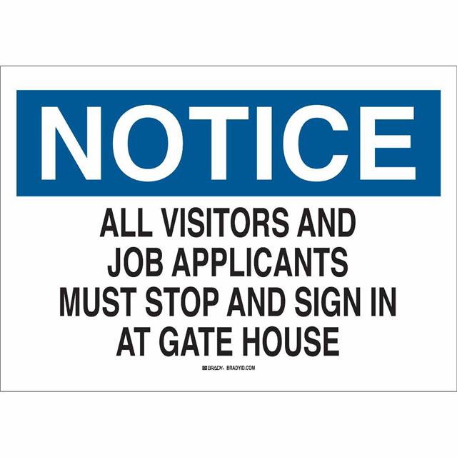 This is manufactured by Brady Corporation. The manufacturer part number is 40703. Label with a size of 10.00" l x 7.00" w (254.0mm x 177.8mm). The product is rohs3 compliant. It is assigned with possible HTSUS value of 8310.00.0000. It is shipped in bulk package . It has a classic black and blue legend, white background colour. The product brady®, is a highly preferred choice for users. The product is made from highly stable and reliable aluminum. In addition, it is reach unaffected. Its typical moisture sensitivity level is not applicable. A bespoke label is a notice. all visitors and job applicants must stop and sign in at gate house label. The product is suitable for use with notice. The product is designated with the ear99 code number.