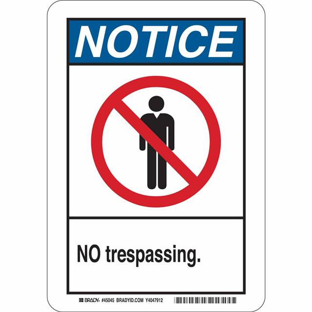 This is manufactured by Brady Corporation. The manufacturer part number is 45045. Label with a size of 10.00" l x 7.00" w (254.0mm x 177.8mm). The product is rohs3 compliant. It is assigned with possible HTSUS value of 3926.90.9985. It is shipped in bulk package . It has a classic black, blue and red legend, white background colour. The product brady®, is a highly preferred choice for users. The product is made from highly stable and reliable polyester. In addition, it is reach unaffected. Its typical moisture sensitivity level is not applicable. A bespoke label is a notice. no trespassing. label. The product is suitable for use with notice. It has a long 4 weeks standard lead time. The product is designated with the ear99 code number.