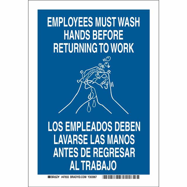This is manufactured by Brady Corporation. The manufacturer part number is 47646. Label with a size of 10.00" l x 7.00" w (254.0mm x 177.8mm). The product is rohs3 compliant. It is assigned with possible HTSUS value of 8310.00.0000. It is shipped in bulk package . It has a classic white legend, blue background colour. The product brady®, is a highly preferred choice for users. The product is made from highly stable and reliable aluminum. In addition, it is reach unaffected. Its typical moisture sensitivity level is not applicable. A bespoke label is a employees must wash hands before returning to work label. The product is suitable for use with warning. It has a long 4 weeks standard lead time. The product is designated with the ear99 code number.