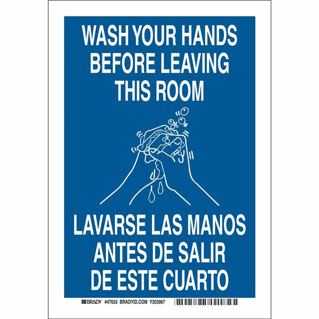This is manufactured by Brady Corporation. The manufacturer part number is 47657. Label with a size of 10.00" l x 7.00" w (254.0mm x 177.8mm). The product is rohs3 compliant. It is assigned with possible HTSUS value of 3926.90.9985. It is shipped in bulk package . It has a classic blue legend, white background colour. The product brady®, is a highly preferred choice for users. The product is made from highly stable and reliable polyester. In addition, it is reach unaffected. Its typical moisture sensitivity level is not applicable. A bespoke label is a wash hands before leaving this room/lavarse las manos antes de salir de este cuarto label. The product is suitable for use with warning. It has a long 4 weeks standard lead time. The product is designated with the ear99 code number.