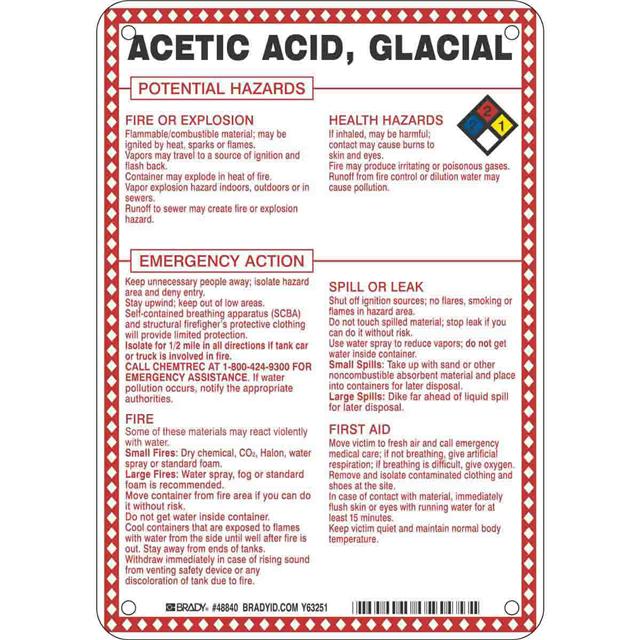 This is manufactured by Brady Corporation. The manufacturer part number is 48840. Label with a size of 10.00" l x 7.00" w (254.0mm x 177.8mm). The product is rohs3 compliant. It is assigned with possible HTSUS value of 3926.90.9985. It is shipped in bulk package . It has a classic black, blue, red and yellow legend, white background colour. The product brady®, is a highly preferred choice for users. The product is made from highly stable and reliable fiberglass. In addition, it is reach unaffected. Its typical moisture sensitivity level is not applicable. A bespoke label is a acetic acid, glacial potential hazards label. The product is suitable for use with warning. It has a long 4 weeks standard lead time. The product is designated with the ear99 code number.