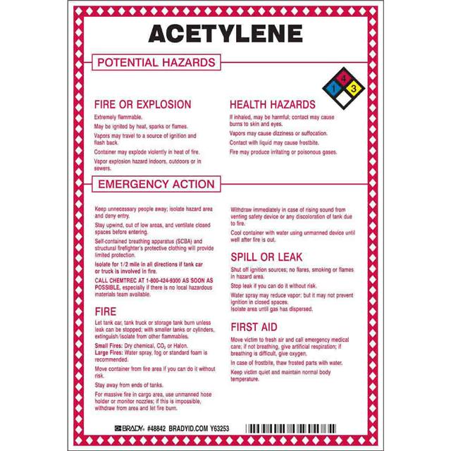 This is manufactured by Brady Corporation. The manufacturer part number is 48842. Label with a size of 10.00" l x 7.00" w (254.0mm x 177.8mm). The product is rohs3 compliant. It is assigned with possible HTSUS value of 3926.90.9985. It is shipped in bulk package . It has a classic black, blue, red and yellow legend, white background colour. The product brady®, is a highly preferred choice for users. The product is made from highly stable and reliable fiberglass. In addition, it is reach unaffected. Its typical moisture sensitivity level is not applicable. A bespoke label is a acetylene potential hazards label. The product is suitable for use with warning. It has a long 4 weeks standard lead time. The product is designated with the ear99 code number.