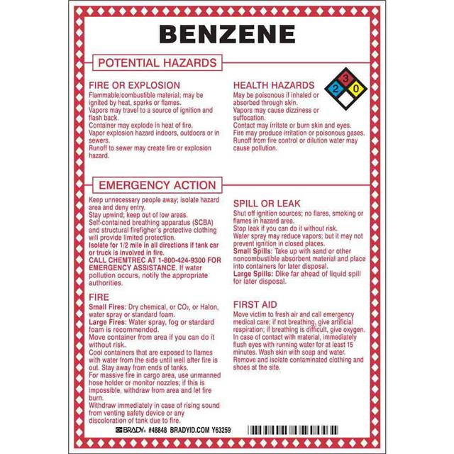 This is manufactured by Brady Corporation. The manufacturer part number is 48848. Label with a size of 10.00" l x 7.00" w (254.0mm x 177.8mm). The product is rohs3 compliant. It is assigned with possible HTSUS value of 3926.90.9989. It has a classic black, blue, red and yellow legend, white background colour. The product brady®, is a highly preferred choice for users. The product is made from highly stable and reliable fiberglass. In addition, it is reach unaffected. Its typical moisture sensitivity level is not applicable. In addition, bulk is the available packaging type of the product. A bespoke label is a benzene potential hazards label. The product is suitable for use with warning. It has a long 4 weeks standard lead time. The brady corporation's product offers user-desired applications. The product is designated with the ear99 code number.