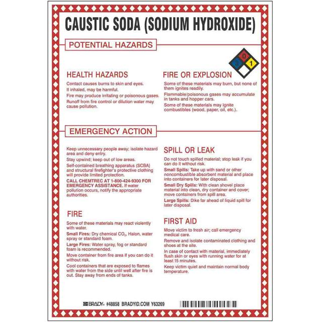 This is manufactured by Brady Corporation. The manufacturer part number is 48858. Label with a size of 10.00" l x 7.00" w (254.0mm x 177.8mm). The product is rohs3 compliant. It is assigned with possible HTSUS value of 3926.90.9985. It is shipped in bulk package . It has a classic black, blue, red and yellow legend, white background colour. The product brady®, is a highly preferred choice for users. The product is made from highly stable and reliable fiberglass. In addition, it is reach unaffected. Its typical moisture sensitivity level is not applicable. A bespoke label is a caustic soda (sodium hydroxide) potential hazards label. The product is suitable for use with warning. It has a long 4 weeks standard lead time. The product is designated with the ear99 code number.