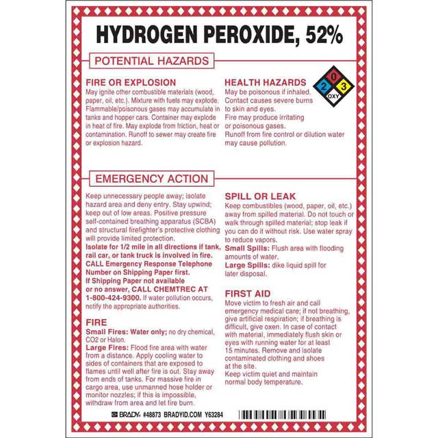 This is manufactured by Brady Corporation. The manufacturer part number is 48873. Label with a size of 10.00" l x 7.00" w (254.0mm x 177.8mm). The product is rohs3 compliant. It is assigned with possible HTSUS value of 3926.90.9989. It has a classic black and red legend, white background colour. The product brady®, is a highly preferred choice for users. The product is made from highly stable and reliable fiberglass. In addition, it is reach unaffected. Its typical moisture sensitivity level is not applicable. In addition, bulk is the available packaging type of the product. A bespoke label is a hydrogen peroxide, 52% potential hazards label. The product is suitable for use with warning. It has a long 4 weeks standard lead time. The brady corporation's product offers user-desired applications. The product is designated with the ear99 code number.