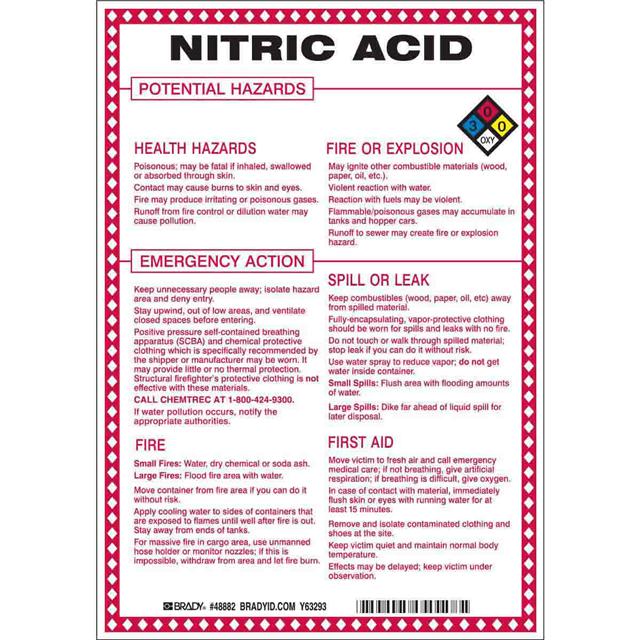 This is manufactured by Brady Corporation. The manufacturer part number is 48882. Label with a size of 10.00" l x 7.00" w (254.0mm x 177.8mm). The product is rohs3 compliant. It is assigned with possible HTSUS value of 3926.90.9985. It is shipped in bulk package . It has a classic black, blue, red and yellow legend, white background colour. The product brady®, is a highly preferred choice for users. The product is made from highly stable and reliable fiberglass. In addition, it is reach unaffected. Its typical moisture sensitivity level is not applicable. A bespoke label is a nitric acid potential hazards label. The product is suitable for use with warning. It has a long 4 weeks standard lead time. The product is designated with the ear99 code number.