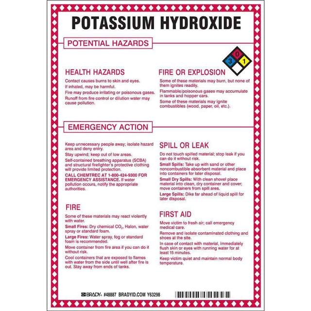 This is manufactured by Brady Corporation. The manufacturer part number is 48887. Label with a size of 10.00" l x 7.00" w (254.0mm x 177.8mm). The product is rohs3 compliant. It is assigned with possible HTSUS value of 3926.90.9985. It is shipped in bulk package . It has a classic black, blue, red and yellow legend, white background colour. The product brady®, is a highly preferred choice for users. The product is made from highly stable and reliable fiberglass. In addition, it is reach unaffected. Its typical moisture sensitivity level is not applicable. A bespoke label is a potassium hydroxide potential hazards label. The product is suitable for use with warning. It has a long 4 weeks standard lead time. The product is designated with the ear99 code number.