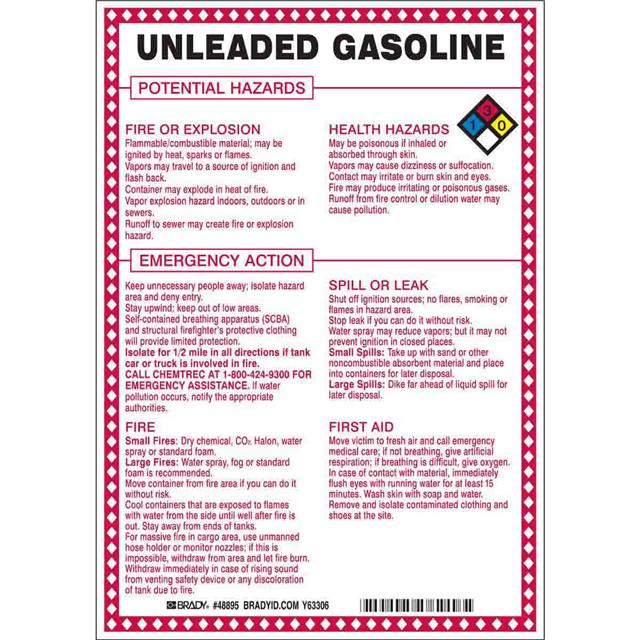 This is manufactured by Brady Corporation. The manufacturer part number is 48895. Label with a size of 10.00" l x 7.00" w (254.0mm x 177.8mm). The product is rohs3 compliant. It is assigned with possible HTSUS value of 3926.90.9989. It has a classic black, blue, red and yellow legend, white background colour. The product brady®, is a highly preferred choice for users. The product is made from highly stable and reliable fiberglass. In addition, it is reach unaffected. Its typical moisture sensitivity level is not applicable. In addition, bulk is the available packaging type of the product. A bespoke label is a unleaded gasoline potential hazards label. The product is suitable for use with warning. It has a long 4 weeks standard lead time. The brady corporation's product offers user-desired applications. The product is designated with the ear99 code number.