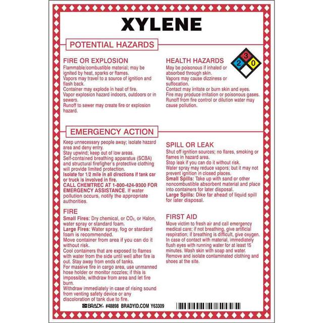 This is manufactured by Brady Corporation. The manufacturer part number is 48898. Label with a size of 10.00" l x 7.00" w (254.0mm x 177.8mm). The product is rohs3 compliant. It is assigned with possible HTSUS value of 3926.90.9989. It has a classic black, blue, red and yellow legend, white background colour. The product brady®, is a highly preferred choice for users. The product is made from highly stable and reliable fiberglass. In addition, it is reach unaffected. Its typical moisture sensitivity level is not applicable. In addition, bulk is the available packaging type of the product. A bespoke label is a xylene potential hazards label. The product is suitable for use with warning. It has a long 4 weeks standard lead time. The brady corporation's product offers user-desired applications. The product is designated with the ear99 code number.