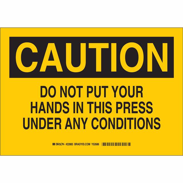 This is manufactured by Brady Corporation. The manufacturer part number is 69138. Label with a size of 10.00" l x 7.00" w (254.0mm x 177.8mm). The product is rohs3 compliant. It is assigned with possible HTSUS value of 3926.90.9985. It is shipped in bulk package . It has a classic black legend, yellow background colour. The product brady®, is a highly preferred choice for users. The product is made from highly stable and reliable fiberglass. In addition, it is reach unaffected. Its typical moisture sensitivity level is not applicable. A bespoke label is a caution. do not put your hands in this press under any conditions label. The product is suitable for use with caution. It has a long 4 weeks standard lead time. The product is designated with the ear99 code number.