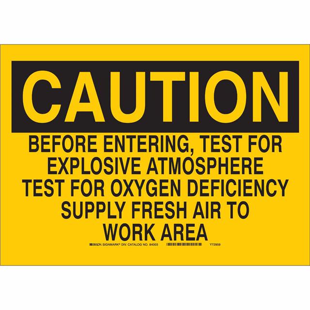 This is manufactured by Brady Corporation. The manufacturer part number is 84002. Label with a size of 10.00" l x 7.00" w (254.0mm x 177.8mm). The product is rohs3 compliant. It is assigned with possible HTSUS value of 3926.90.9985. It is shipped in bulk package . It has a classic black legend, yellow background colour. The product brady®, is a highly preferred choice for users. The product is made from highly stable and reliable polyester. In addition, it is reach unaffected. Its typical moisture sensitivity level is not applicable. A bespoke label is a caution. before entering, test for explosive atmosphere test for oxygen deficiency supply fresh air to work area label. The product is suitable for use with caution. It has a long 4 weeks standard lead time. The product is designated with the ear99 code number.