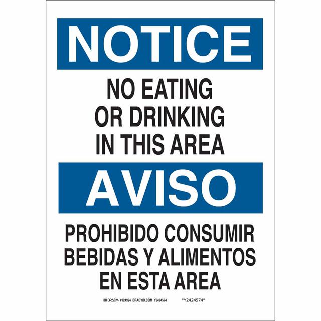 This is manufactured by Brady Corporation. The manufacturer part number is 90668. Label with a size of 14.00" l x 10.00" w (355.6mm x 254.0mm). The product is rohs3 compliant. It is assigned with possible HTSUS value of 3926.90.9985. It is shipped in bulk package . It has a classic black and blue legend, white background colour. The product brady®, is a highly preferred choice for users. The product is made from highly stable and reliable polyester. In addition, it is reach unaffected. Its typical moisture sensitivity level is not applicable. A bespoke label is a notice/aviso. no eating or drinking in this area/prohibido consumir bebidas y alimentos en este area label. The product is suitable for use with notice. It has a long 4 weeks standard lead time. The product is designated with the ear99 code number.