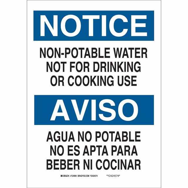 This is manufactured by Brady Corporation. The manufacturer part number is 90674. Label with a size of 14.00" l x 10.00" w (355.6mm x 254.0mm). The product is rohs3 compliant. It is assigned with possible HTSUS value of 3926.90.9985. It is shipped in bulk package . It has a classic black and blue legend, white background colour. The product brady®, is a highly preferred choice for users. The product is made from highly stable and reliable polyester. In addition, it is reach unaffected. Its typical moisture sensitivity level is not applicable. A bespoke label is a notice/aviso. non-potable water not for drinking or cooking use/agua no potable no es apta para beber ni cocinar label. The product is suitable for use with notice. It has a long 4 weeks standard lead time. The product is designated with the ear99 code number.