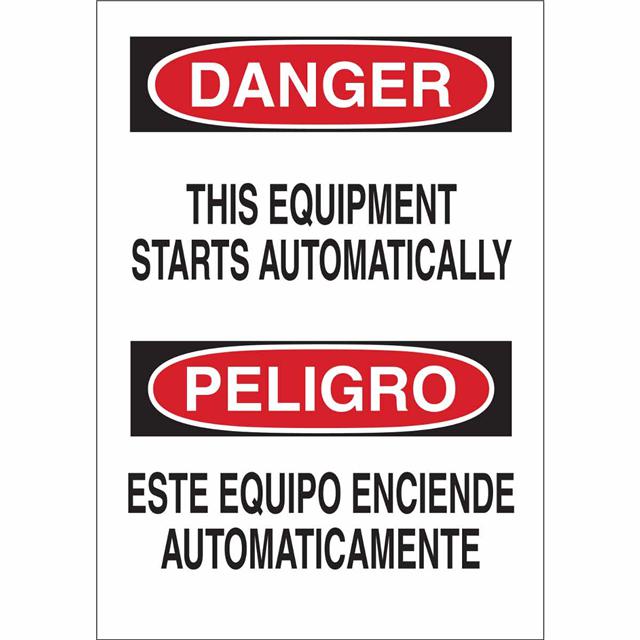This is manufactured by Brady Corporation. The manufacturer part number is 90795. Label with a size of 14.00" l x 10.00" w (355.6mm x 254.0mm). The product is rohs3 compliant. It is assigned with possible HTSUS value of 3926.90.9985. It is shipped in bulk package . It has a classic black and red legend, white background colour. The product brady®, is a highly preferred choice for users. The product is made from highly stable and reliable polyester. In addition, it is reach unaffected. Its typical moisture sensitivity level is not applicable. A bespoke label is a danger/peligro. this equipment starts automatically/este equipo enciende automaticamente label. The product is suitable for use with danger. It has a long 4 weeks standard lead time. The product is designated with the ear99 code number.
