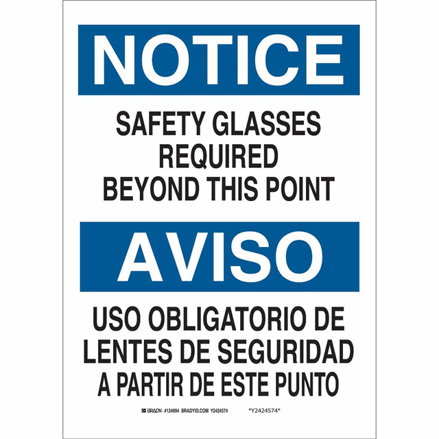 This is manufactured by Brady Corporation. The manufacturer part number is 90808. Label with a size of 14.00" l x 10.00" w (355.6mm x 254.0mm). The product is rohs3 compliant. It is assigned with possible HTSUS value of 3926.90.9989. It has a classic black and blue legend, white background colour. The product brady®, is a highly preferred choice for users. The product is made from highly stable and reliable polyester. In addition, it is reach unaffected. Its typical moisture sensitivity level is not applicable. In addition, bulk is the available packaging type of the product. A bespoke label is a notice/aviso. safety glasses required beyond this point/uso obligatorio de lentes de seguridad a partir de este punto label. The product is suitable for use with notice. It has a long 4 weeks standard lead time. The brady corporation's product offers user-desired applications. The product is designated with the ear99 code number.