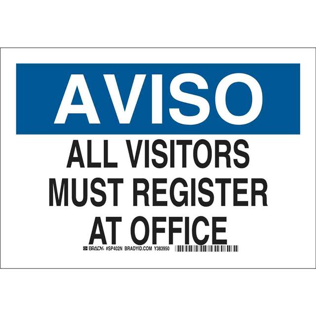 This is manufactured by Brady Corporation. The manufacturer part number is SP402N. Label with a size of 14.00" l x 10.00" w (355.6mm x 254.0mm). The product is rohs3 compliant. It is assigned with possible HTSUS value of 3926.90.9985. It is shipped in bulk package . It has a classic black and blue legend, white background colour. The product brady®, is a highly preferred choice for users. The product is made from highly stable and reliable polyester. In addition, it is reach unaffected. Its typical moisture sensitivity level is not applicable. A bespoke label is a aviso. all visitors must register at office label. The product is suitable for use with warning. It has a long 4 weeks standard lead time. The product is designated with the ear99 code number.