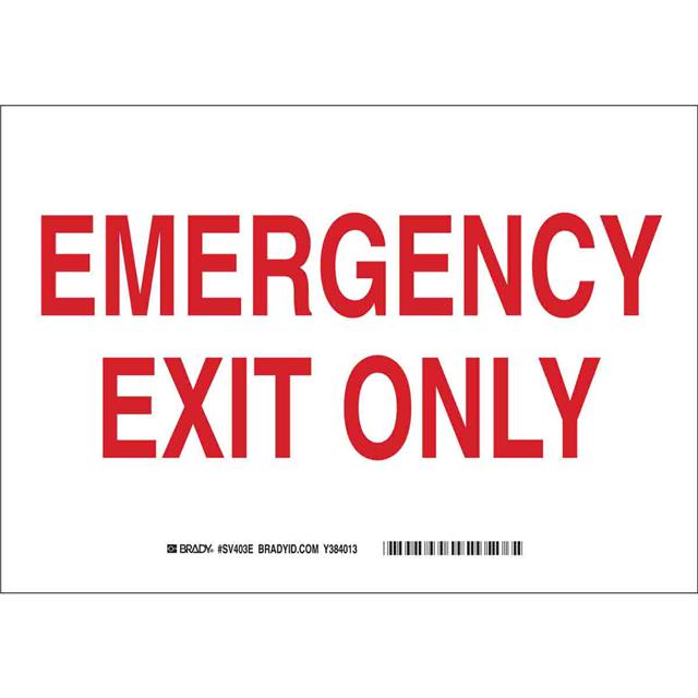 This is manufactured by Brady Corporation. The manufacturer part number is SV403E. Label with a size of 14.00" l x 10.00" w (355.6mm x 254.0mm). The product is rohs3 compliant. It is assigned with possible HTSUS value of 3926.90.9985. It is shipped in bulk package . It has a classic red legend, white background colour. The product brady®, is a highly preferred choice for users. The product is made from highly stable and reliable polyester. In addition, it is reach unaffected. Its typical moisture sensitivity level is not applicable. A bespoke label is a emergency exit only label. The product is suitable for use with emergency. It has a long 4 weeks standard lead time. The product is designated with the ear99 code number.